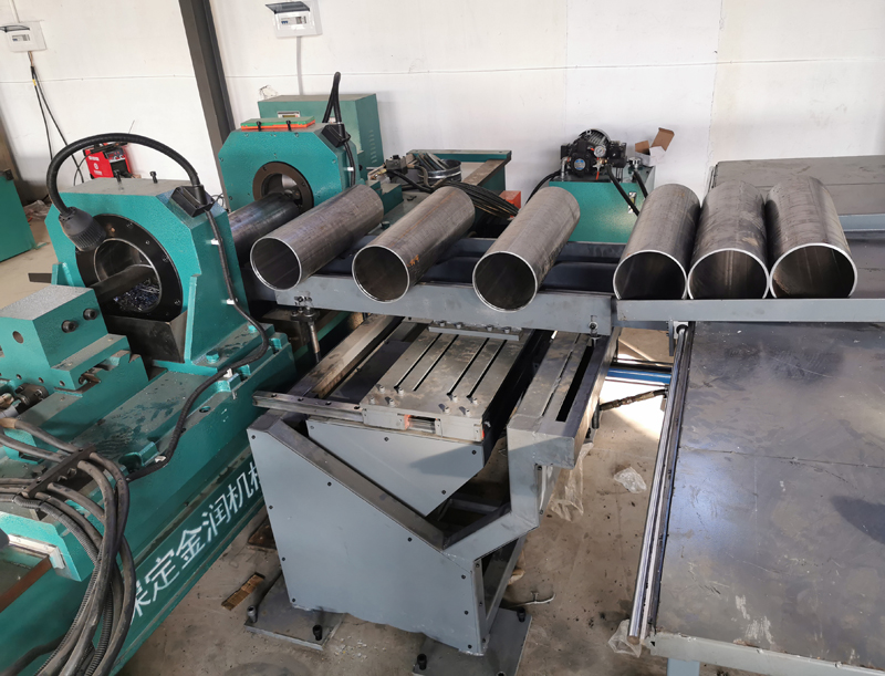 8、高配機型帶有自動供料系統(另行單獨選購),普通工人(或女工,無需有任何專業技能)只需要將多根管料擺放到自動供料系統的料架上,設備即可自動完成 進料→加工→出料的工藝循環,只需一人即可看顧切管機和車孔機床兩臺設備,工人勞動強度低,無需人工值守,為企業增加經濟效益。